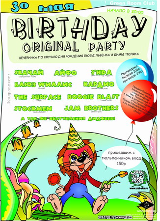 в группе СКАчай 2 именинника!перкуссионист Люба Львенок и басист Дима!всех приглашаем на вечеринку по случаю их дня рождения! 30 мая "Green Room Club"